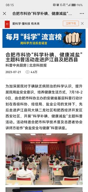本次活動(dòng)由合肥市科學(xué)技術(shù)協(xié)會(huì)主辦,得到巢湖市鹽業(yè)公司、廬江縣鹽業(yè)公司、肥西縣鹽業(yè)公司的大力支持。