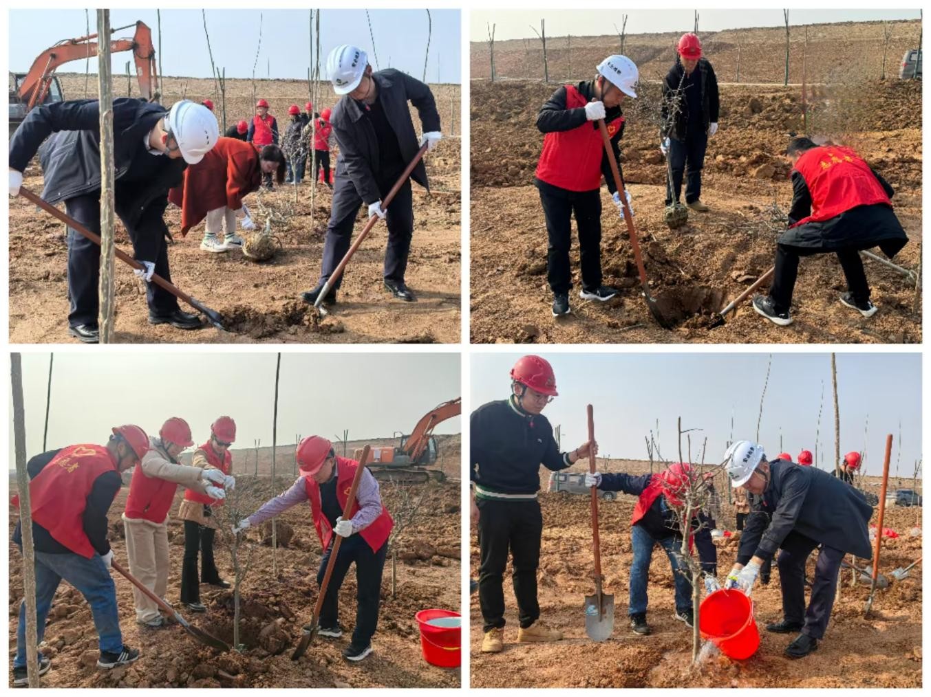 全體人員到達(dá)植樹地點(diǎn)后,拿起工具熱情高漲地投入到植樹活動(dòng)中。活動(dòng)現(xiàn)場,大家分工協(xié)作,揮鍬培土、扶苗填坑、澆水灌溉,配合默契,干勁十足,有條不紊地將樹苗植入土中。為了提高樹苗的存活率,大家細(xì)心地用鐵鍬一點(diǎn)點(diǎn)鏟碎結(jié)塊的土壤,用細(xì)節(jié)傳承國企品質(zhì)。經(jīng)過大家的辛勤勞動(dòng),一棵棵新栽的樹苗迎風(fēng)挺立,萌發(fā)盎然生機(jī),與施工現(xiàn)場的機(jī)械轟鳴聲交相輝映,勾勒出一幅“綠色與建設(shè)共生”的生動(dòng)畫面。